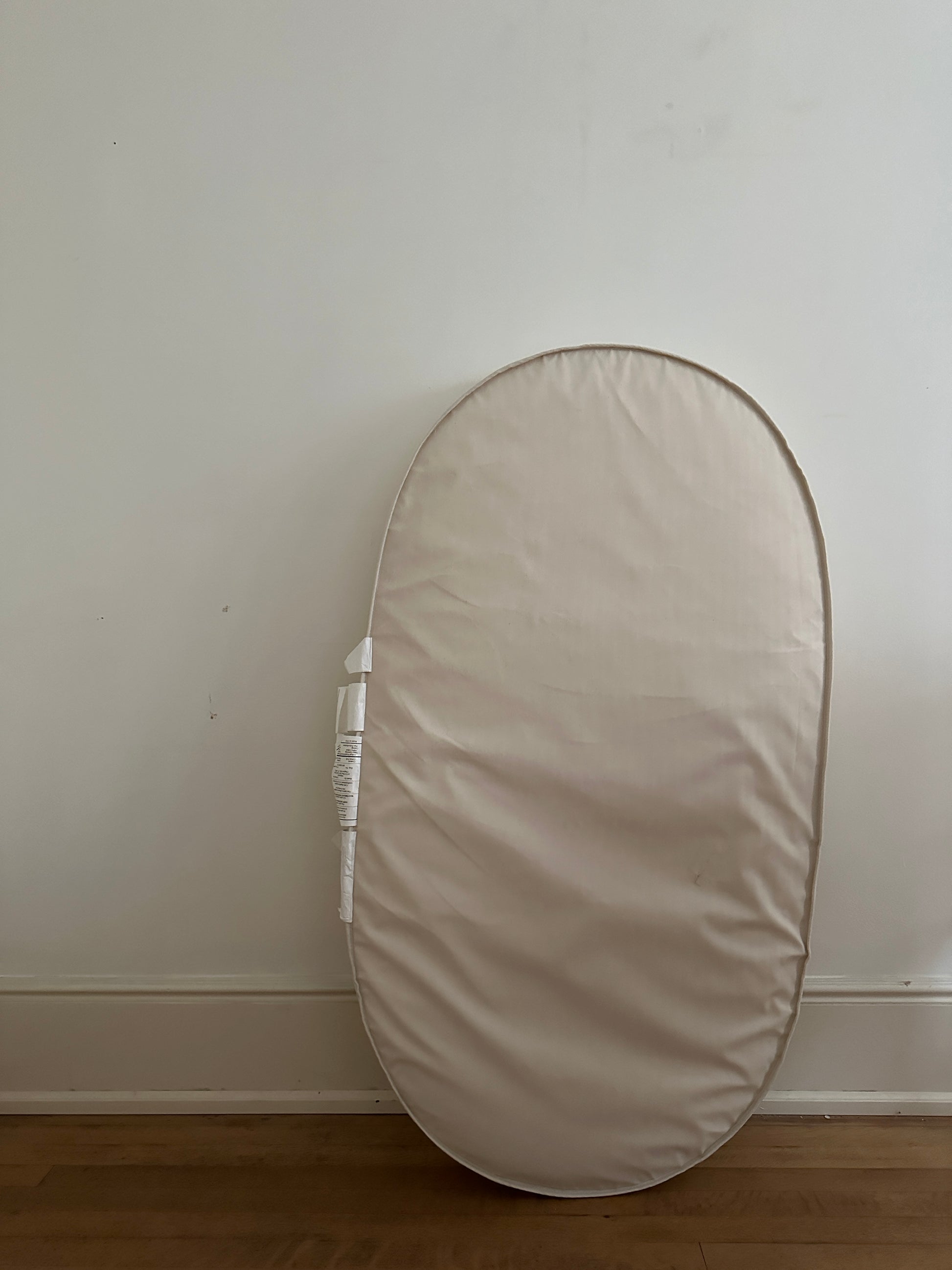 our beloved stokke crib, lovingly used + adored by us. this sweet mini crib is housed on wheels, making it easy to move throughout your home during the blissful newborn days. included is the crib extender, which allows the mini crib to become a full size crib +/or toddler bed. also included is a gently used naturpedic organic cotton oval crib mattress and Pehr linen canopy + crib sheet.