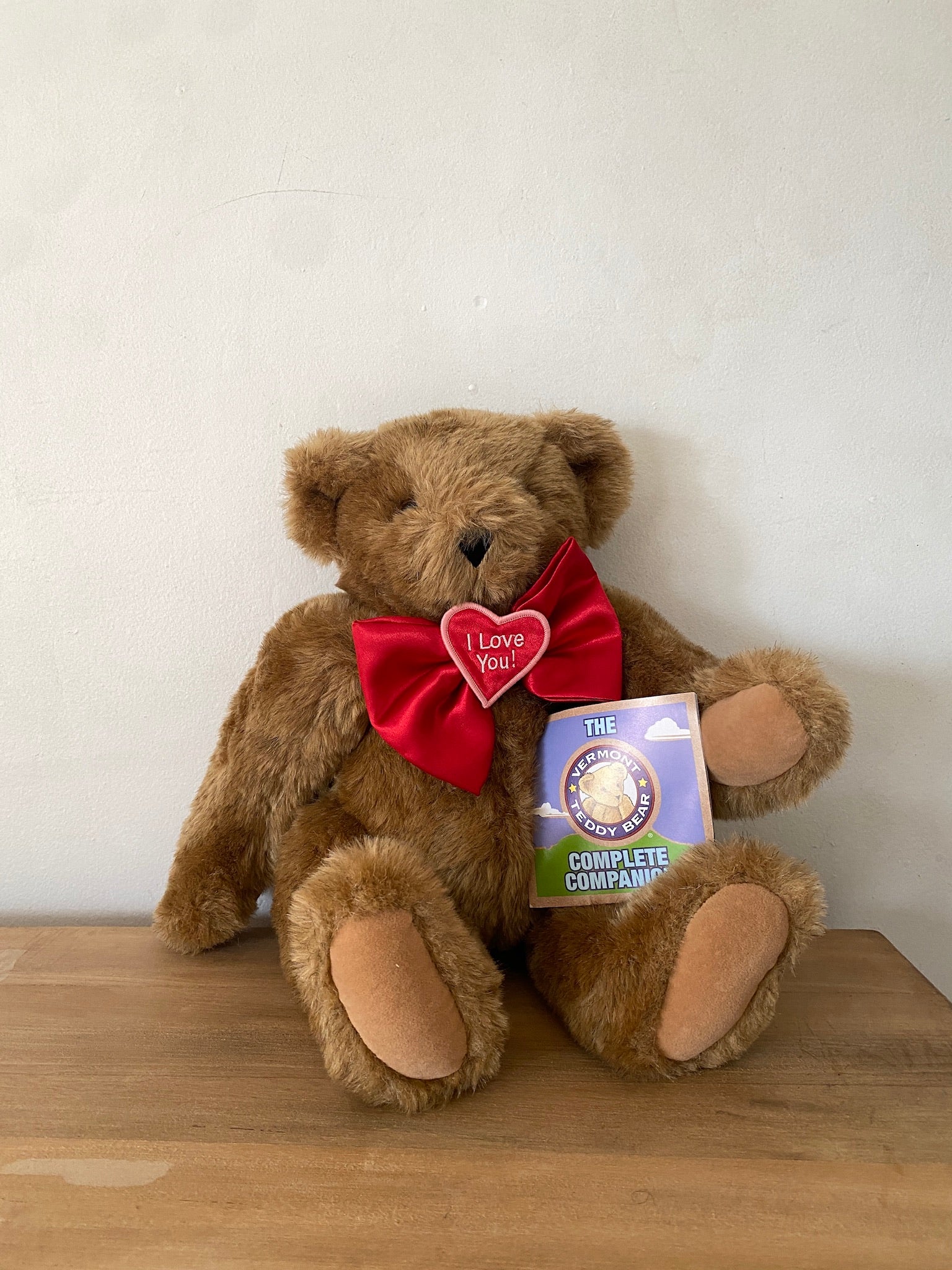 a vintage vermont teddy bear with an 'I love you' bow tie and tags still attached. would make for the sweetest valentine's day present.